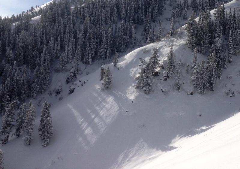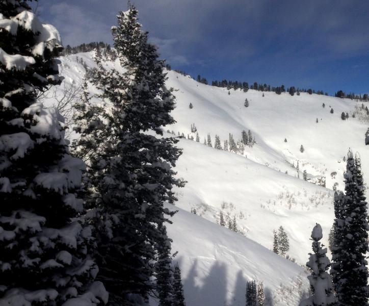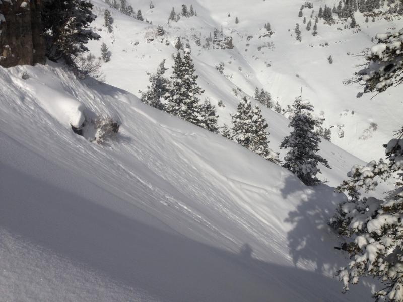 We observed evidence of fairly extensive natural soft slab activity in Wood Camp from during the Boxing Day storm... The avalanches on steep slopes above around 7500' in elevation and facing southeast through north were around a foot deep and up to around 150' wide.