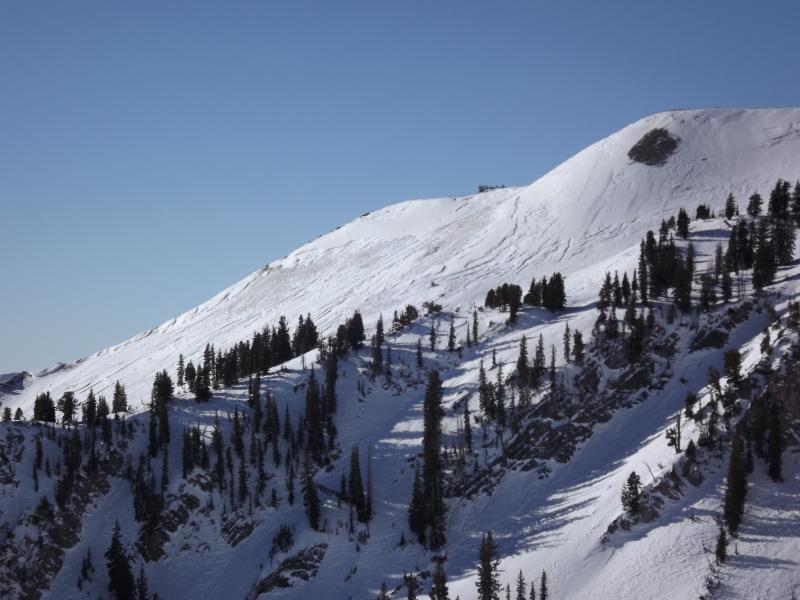 While doing some scouting in the far reaches of Snowbird's Mineral Basin, I noticed this slide on Major Evans off in the distance. It is hard to say exactly when this slide ran, but it must have been between the 1/11 storm and the 1/16 wind event. This terrain is seldom visited by humans due to the location and difficulty of access. In the photos there is a clear crown face and the bed surface had been scoured by the strong N and NE winds earlier this week. Notice the bald spot near the summit. This spot seems to always be devoid of snow and is indicative of the wind that flows through that drainage. Some large pieces of cornice/crown are visible in the second and third pictures, along with some severe wind damage to the bed surface.