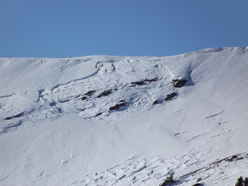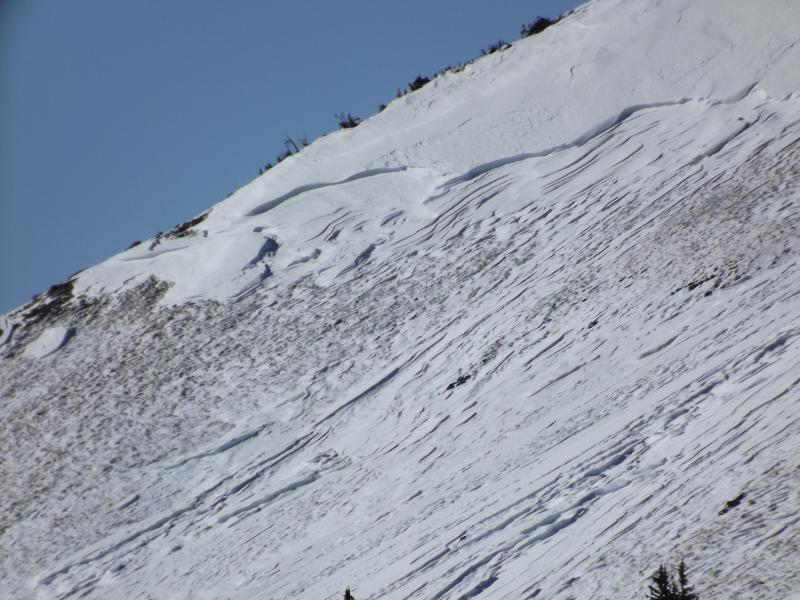 My hypothesis is that the slope was loaded with snow and SW winds during the beginning of the last storm and then ran naturally. The following wind event then scoured the bed surface to the ground. Even so, it looks like the crown face was up to several feet deep in some locations and involved most of the season's snow pack. A smaller subsidiary slide (4th photo) was noticed just to the north of the main slide.