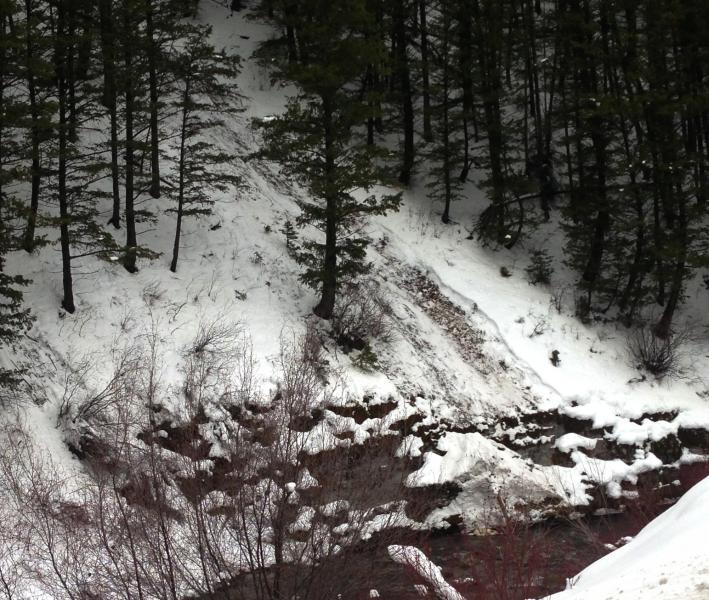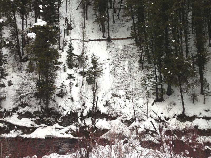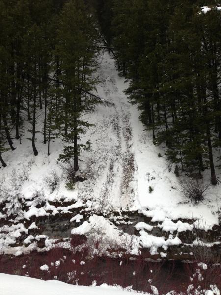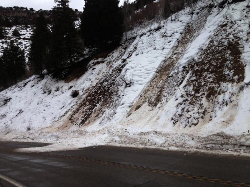 A natural wet avalanche cycle in Logan Canyon at lower elevations. Shallow wet avalanches overnight and today hit the Logan River in many places, the Logan River Trail, and Hwy 89, cleaning out the shallow weak saturated snow to the ground...