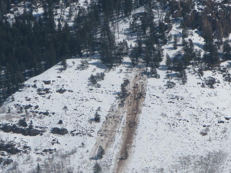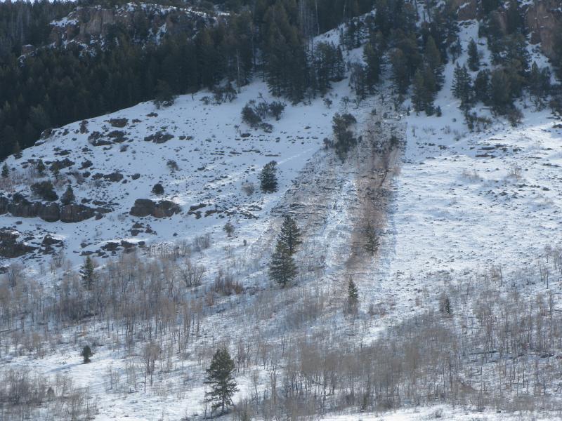 I noticed this wet avalanche around 10:00 this morning, so I'm guessing it happened yesterday evening. I took a few photos from below and across the Canyon... Obviously, shallow snow is an issue in this area.