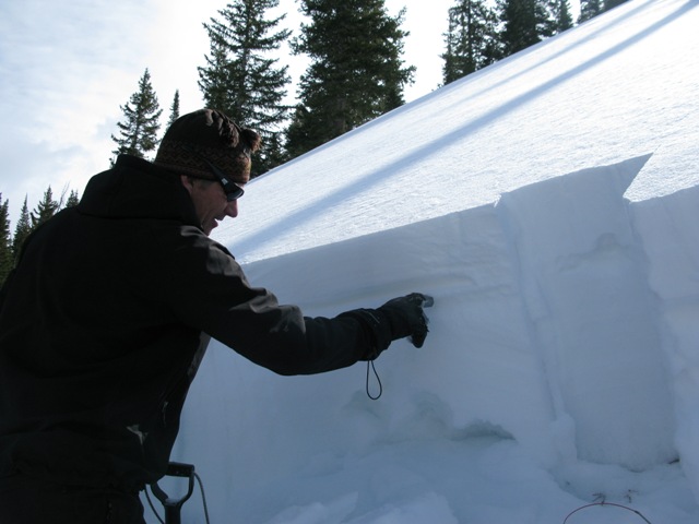 Ted points to a thin heat crust. Above that a four finger slab from last week storm... below is nothin' but shugga.