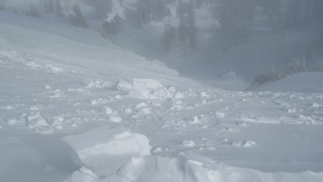 This is looking down the the chunk-filled path of the avalanche. The avalanche ran about 600 vertical feet down the the bench below the bowl.