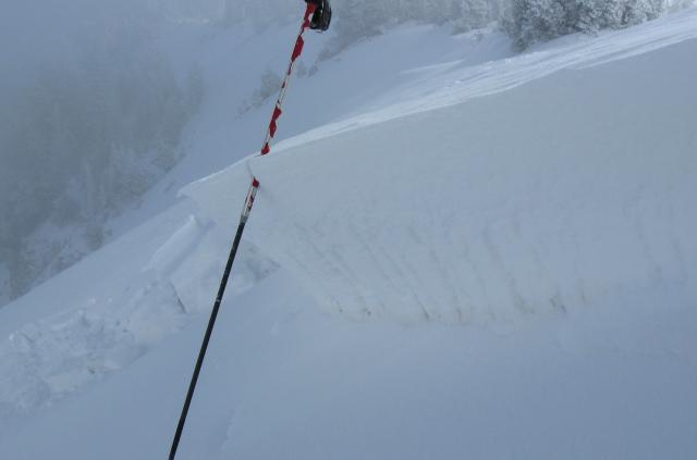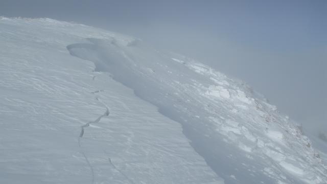 I triggered this sizable wind slab avalanche while stomping along Cornice Ridge. Unintentional in that it was quite a bit larger and the slope much more sensitive than I expected...
