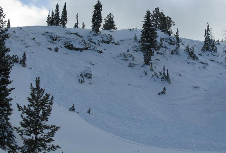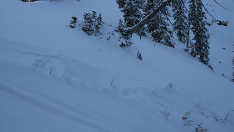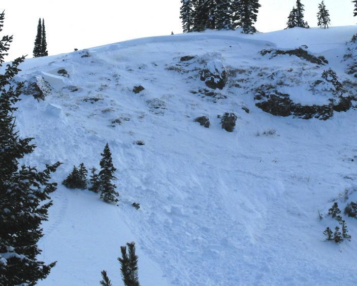 This is a look at the north side of the crown... A stout slab formed with last weekend's storm (12-13-09) right on top of very weak sugar-like faceted snow..... Obviously conditions are still quite sensitive and scary in the Logan Area Backcountry, especially on slopes like this; fairly steep, wind-loaded, north facing, and upper elevation....I'm glad we triggered this one from a distance....This could easily have been a killer...