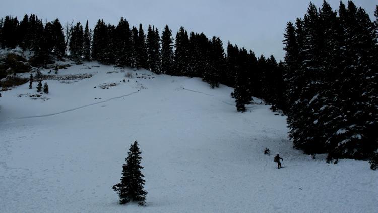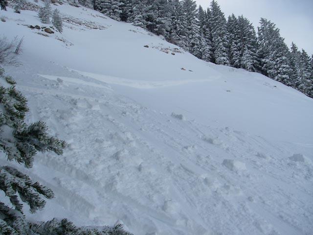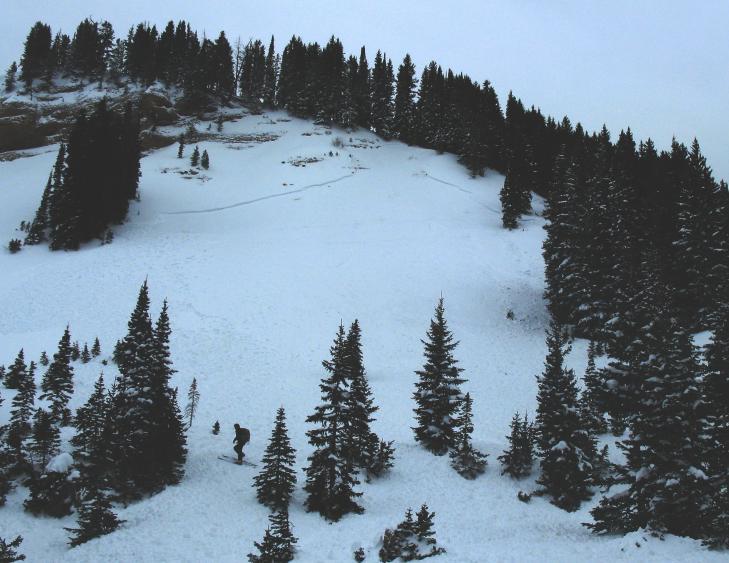 The avalanche ran well into the flats below the bowl, piling debris deeply against the sparse trees in the run-out, and over-running the site of the historic avalanche fatality.....