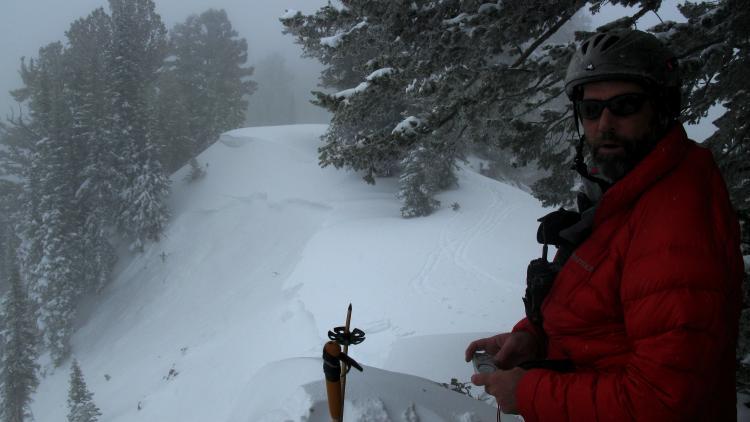 I triggered this sizable avalanche by knocking a small cornice onto the slope while holding onto the strong green branches of a ridge-top spruce....