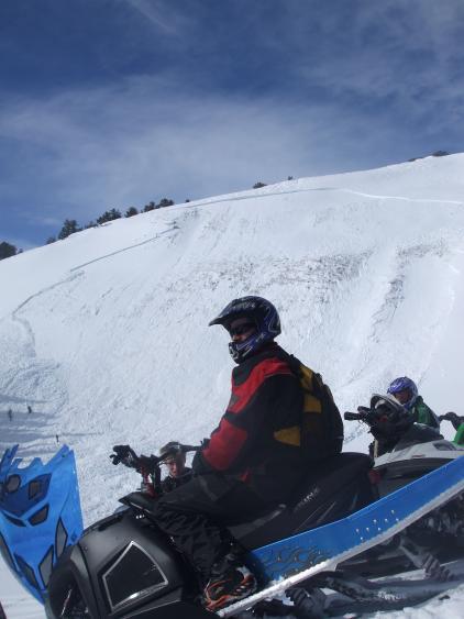 Rider triggered this avalanche from fairly high on the slope as he was turning his sled. He punched it and somehow emerged at the b