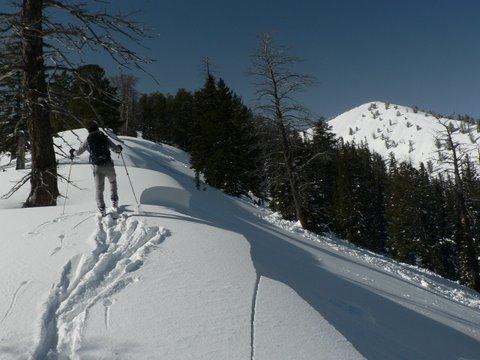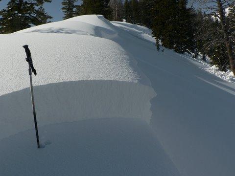 Today (Sunday Feb 14) we skied more ridge lines and S aspects, but triggered another, larger, slide remotely (first 4 photos--all in sun)
