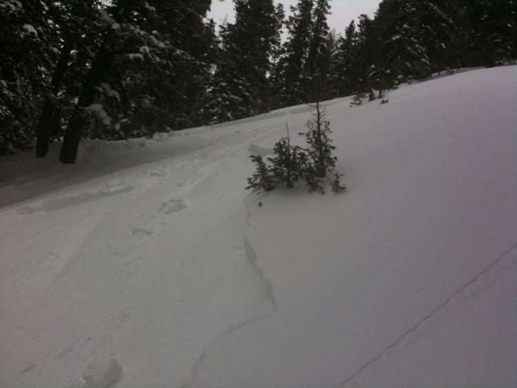 A rider in our party triggered this avalanche on a N facing slope at about 8700 feet just southeast of White Pine Lake. Slope angle