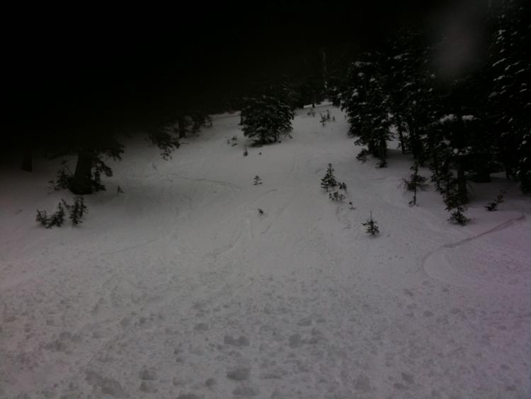 Debris piled up 6-8 feet deep at the toe of the slide coming to rest in a large clump of pines.