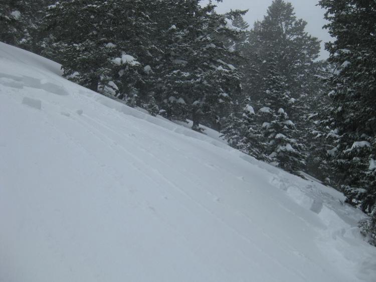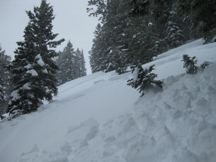 After triggering the first avalanche, we decided to ski some mellow tree shots well away from the main slide path. We descended the