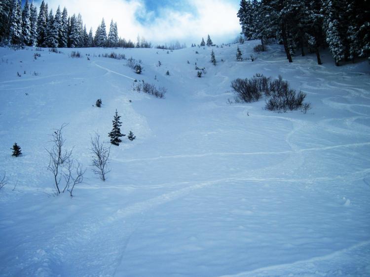 The second larger slide is about 10" deep and 80 feet wide. It ran to the flats below. The picture shows the fresh slide on the skier's right as well as the now covered deposition from last Saturday's larger and longer running avalanche. Looks to have been unintentionally triggered from above.