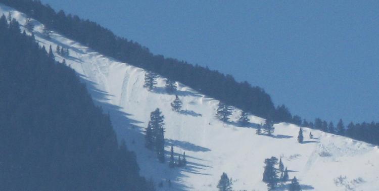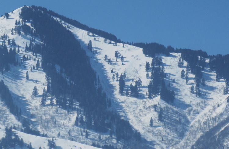 I noticed some significant slides in Straight canyon (Big Kahuna) and off the East Slope of Mendon Peak (Bird Canyon). It looked like someone was kicking off slides all the way up the ridge headed to Big Kahuna but I couldn't see any skin tracks. There were probably a half a dozen slides but the most significant started at 8000 ft and ran to 6600 ft. The deposit looked pretty significant in the bottom gully. I would estimate the soft slab up top to be approximately 50 feet wide and not too deep, probably just the most recent layer of snow. There were some other decent sized slides into Bird canyon. Like I said earlier, it looked like someone was kicking the slides off because there were so many but I couldn't see any tracks with a 60X spotting scope. The slides looked pretty recent like today or maybe yesterday. I am guessing the wind loading from last night overloaded the latest weak layer. The were two other small slides in Deep canyon but they did not run far at all.