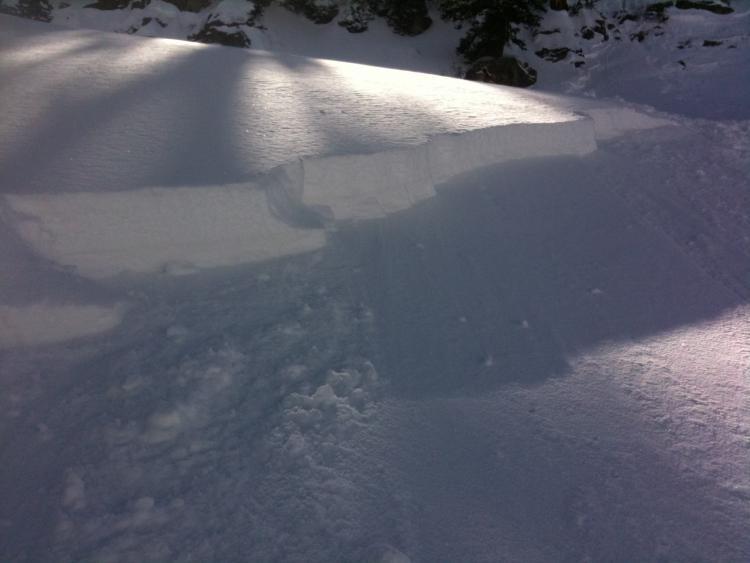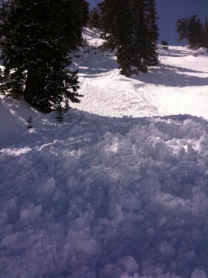 This soft slab pulled out on a NE facing slope at around 8800 feet. Triggered by a snowboarder who was caught and carried about 100 feet across a band of rocks and managed to stay on top of debris. Crown ranged from 12 to 18 inches breaking on a smooth sun crust beneath the new snow. The rider entered the top corner of this wind-loaded slope headed toward a less aggressive line. His one turn was enough to cause this slab to break and he was sucked into the path and dragged downslope 100 feet or so.