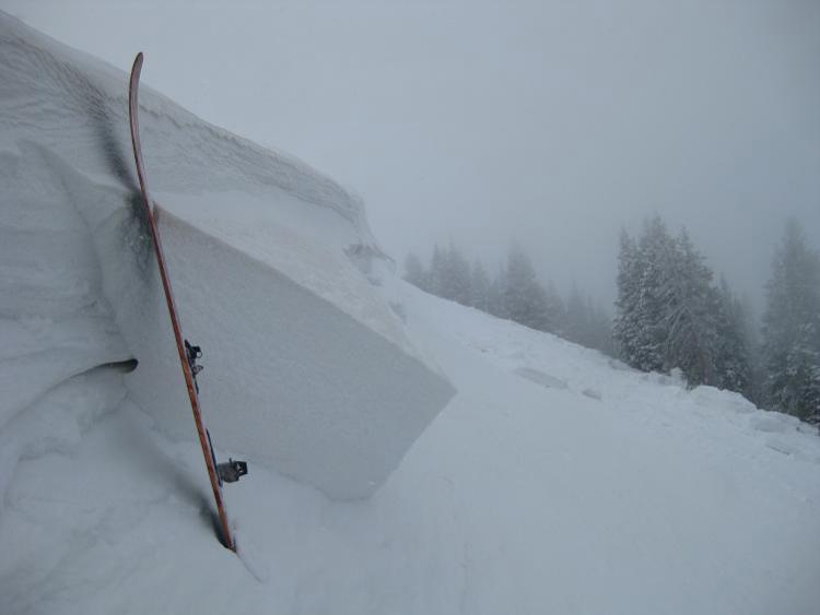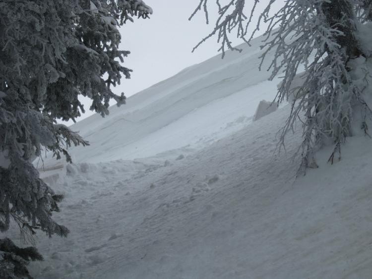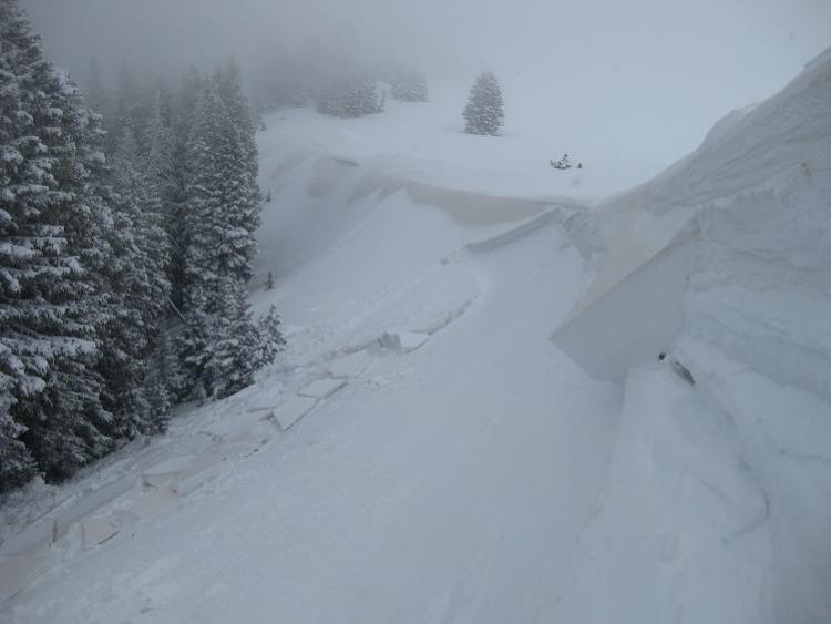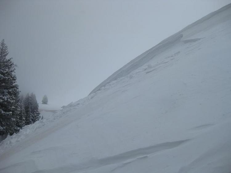 We remotely triggered a HUGE hard slab in the slide path just east of Dog Leg. We were well below the ridge on a relatively low-angle slope when we decided to head down - we each did a hard ski cut over a small, obvious pillow - maybe 30 degrees at the steepest - towards a very dense stand of trees. Neither cut released the pillow, but the second remotely triggered a monster hard slab further up the ridge. Pic#1 shows approximately where we started our ski cuts when we triggered the slide. We were safely out of the slide path in the trees, but had a nice view of the river of debris washing by and waaay down through the trees. It appears that relentless NW winds have deposited massive amounts of snow in the concave NNE slope, and an old cornice / crown helped trap the wind-blown snow rather than let it blow up an over the ridge. The slab was knife-hard, with concrete-like blocks gouging paths through the trees. A significant amount of new snow (well below the ridge) was also involved. Aspect: average NNE. Elevation: 9000'. Slope: 35-45 at the top. Depth: between 1 and maybe 6 or 7' (the middle part of the crown was monstrous). Average about 3-4' - the fourth picture shows a typical section of the crown; the middle part was at least double in height. Width - enormous - I'm guessing 600'. Vertical - ~600'.