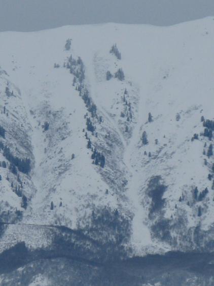 I could see that most of the major avalanche paths on the east side of the Wellsville Range west of Mendon have naturally avalanched. Of note are large avalanches in Pine and Old Log-way Canyons, which ran around 2500'.