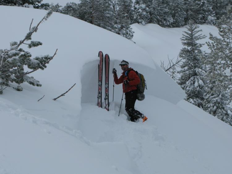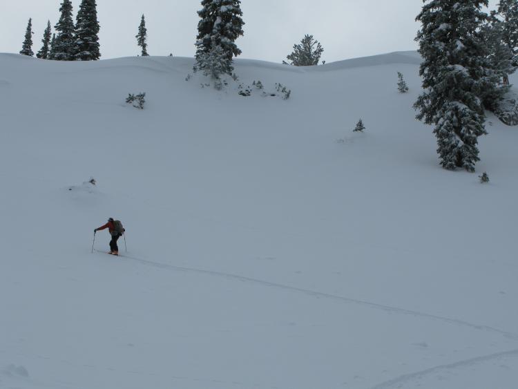 Darren is using the avalanche as a fairly safe route to the ridge. There is not any unstable snow left on this route...