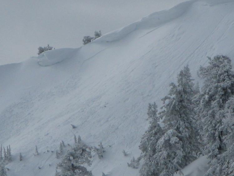 You can see a blown-in crown on the southeast facing side of the bowl from the 12/19-12/20 natural cycle (visible in the upper right.) A new avalanche in the same path was triggered by cornice fall last night 12/22-12/23....