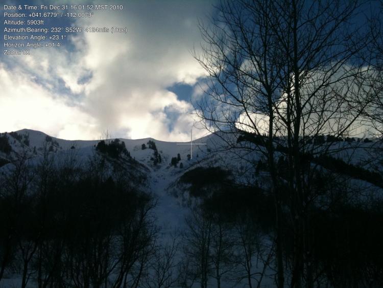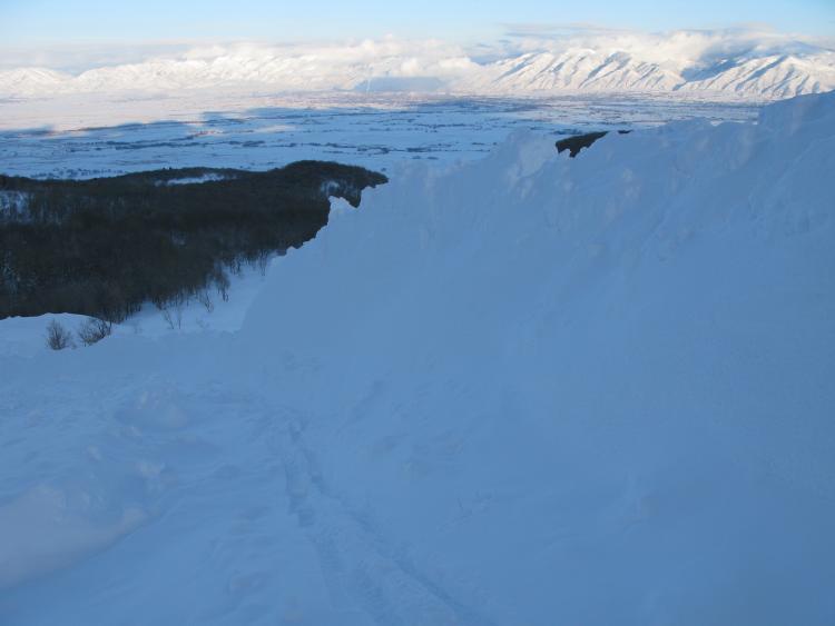 In a brief clearing yesterday evening both Eric and I noticed a change in the run out cones on Maple Bench below the big east facing avalanche paths above Mendon. It appeared as though several of the paths naturally avalanched with Wednesday's heavy snowfall.. My first impression is that these were fairly long-running avalanches, with debris spilling well out onto the flat benches below the flow directing gullies....