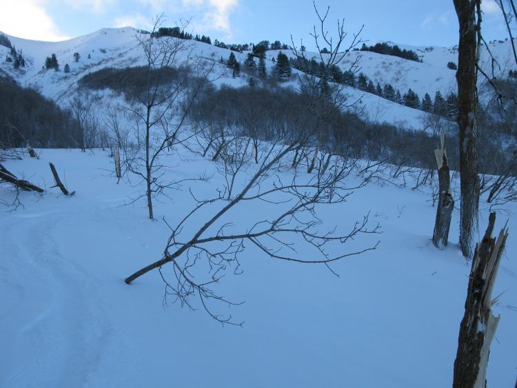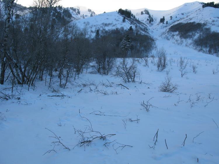 Here, I'm looking from the toe of the Old Logway Avalanche uphill toward the probable area of the crown, which has been blown in and obscured since the avalanche.