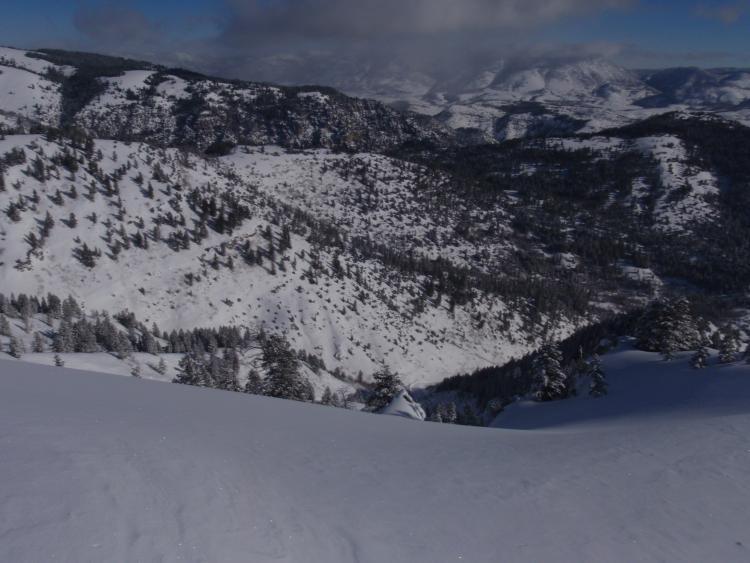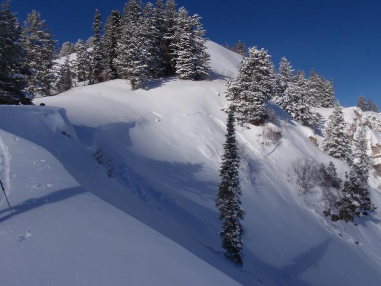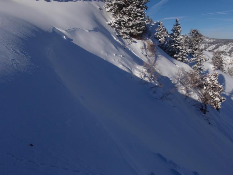 Relatively small crowns were evident on several E and NE facing slopes (photos 41 and 81). Avalanche debris that appeared to be fed from several distinct slides had collected at the bottom of the valley (barely visible in photo 36).