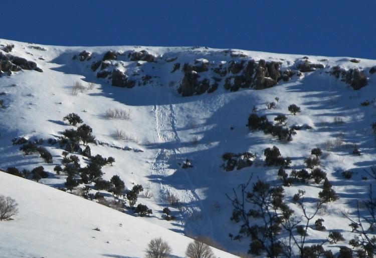 This recent wind slab release southwest of Logan Peak was probably also triggered by cornice fall sometime earlier in the week. Yep, that's Ben Lomond Peak in the background.....