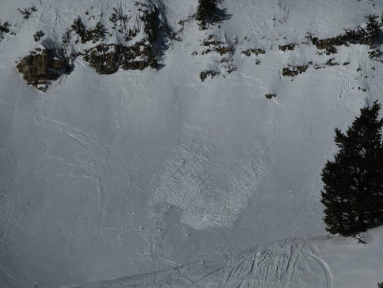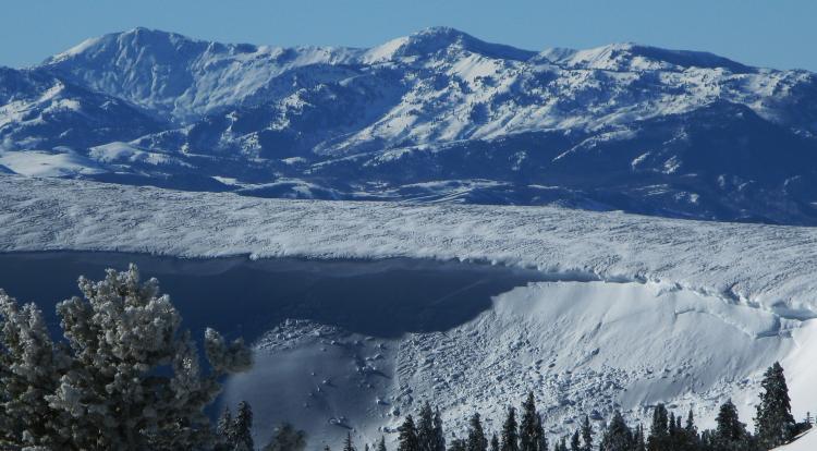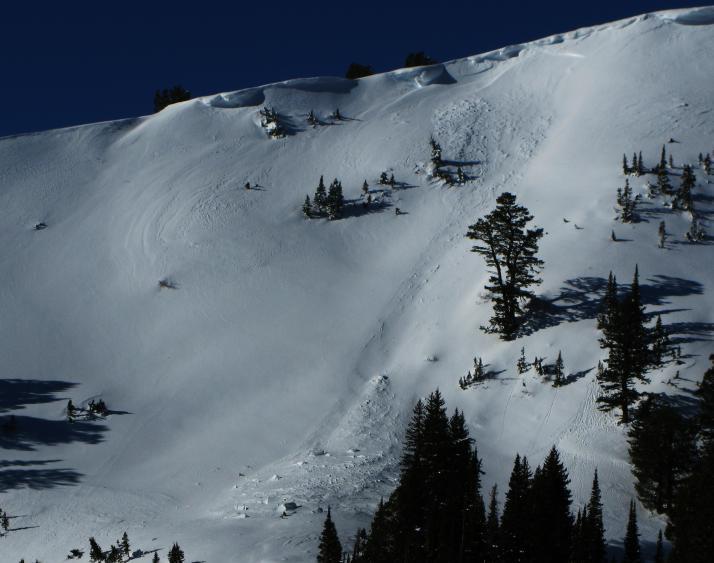 This fairly recent natural wind slab avalanche off the south ridge of Providence Peak may have been triggered by cornice fall.....