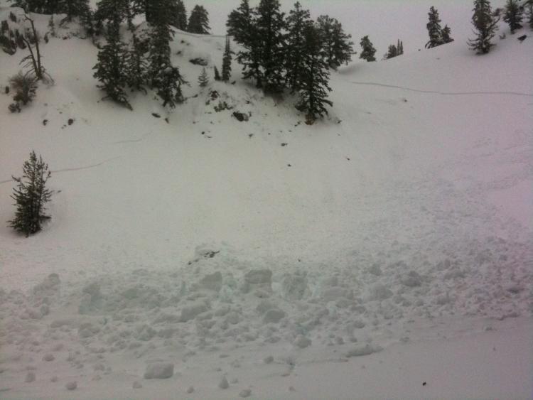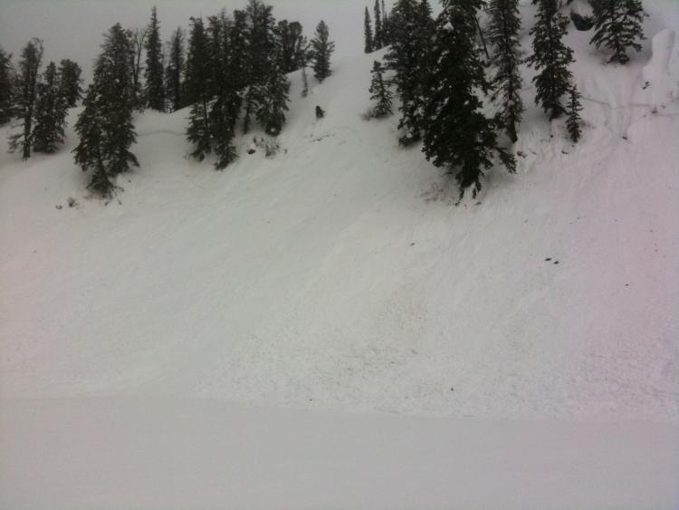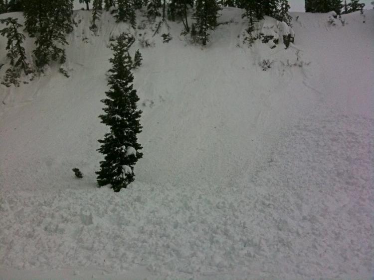 This one looked to be about 18 inches deep as well. 300 feet wide and running 300 or so vertical feet. Warm heavy snow and rain was likely the trigger overnight or early this morning. Big piles of debris - probably 8 feet deep or so.