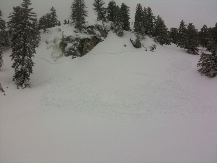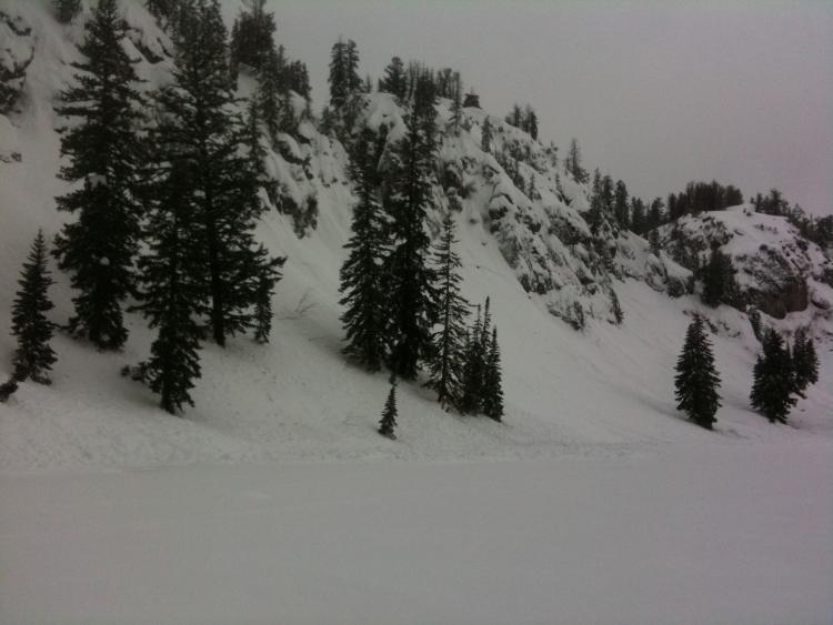 12-18 inch crown breaking about 300 feet wide and running about 100 vertical feet. Heavy snow/rain was likely the trigger last night or this morning.