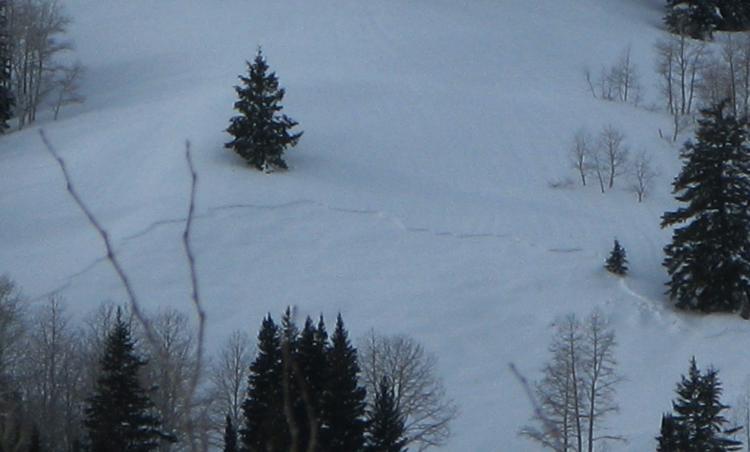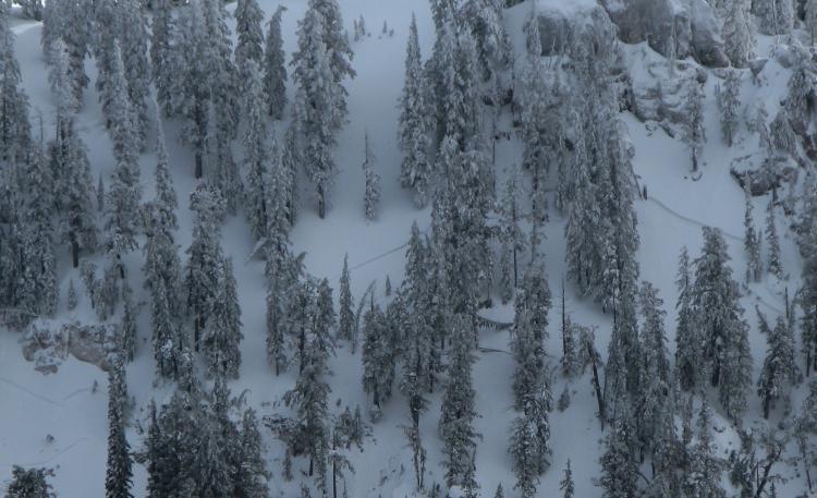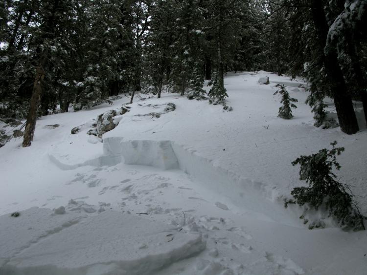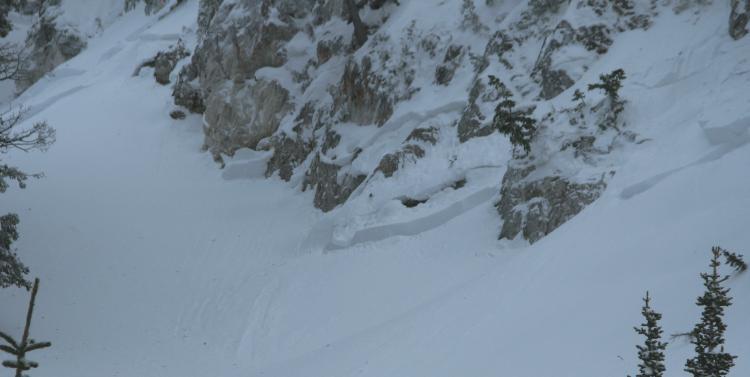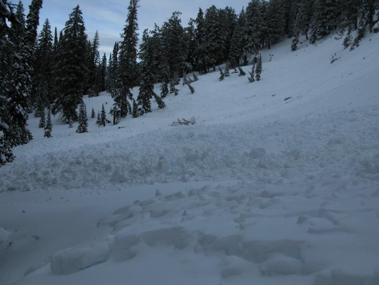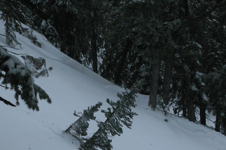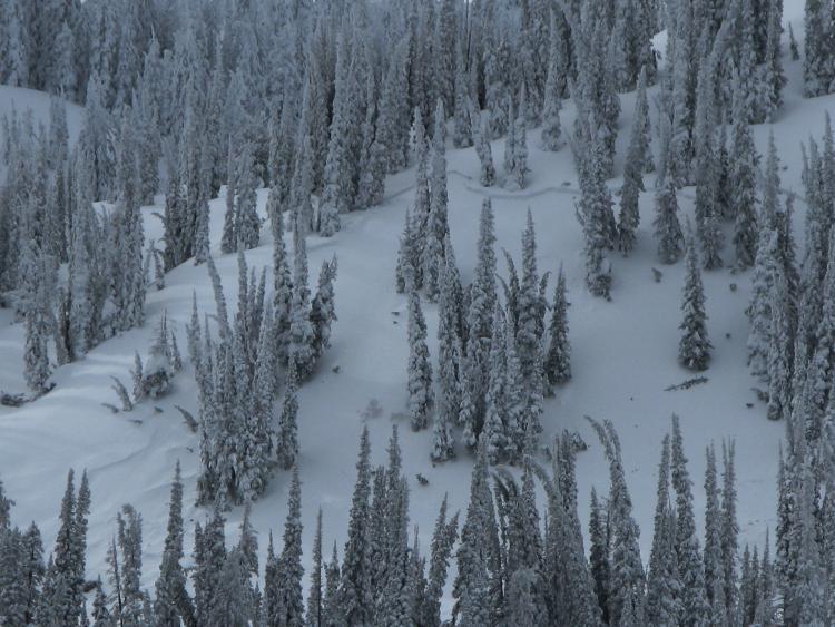 Many slopes in the Steep Hollow Area naturally avalanched during the ice storm overnight of 1-16/1-17.... I took a good look at the avalanches on the steep treed slopes on the south side of the box canyon... A complex of large hard slab avalanches stretched across the face with large and very deep piles of debris stacked up on trees and along the flat bench below the slope. The 1 to 3 foot deep hard slabs released on a couple weak layers formed when near the snow surface. I found large rimed crystals and sugary facets in the lower shear plane....
