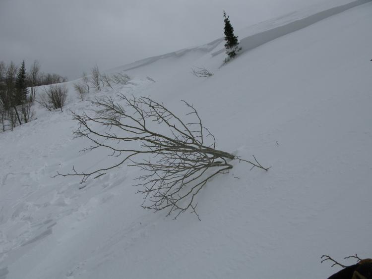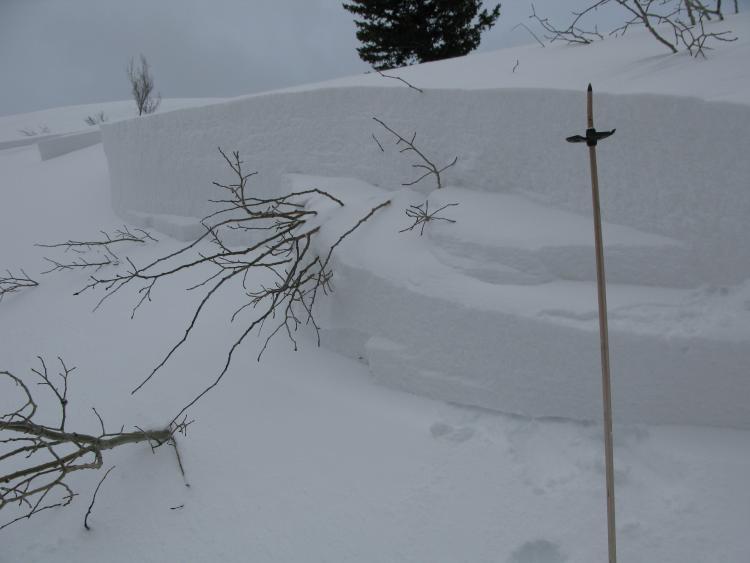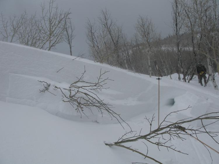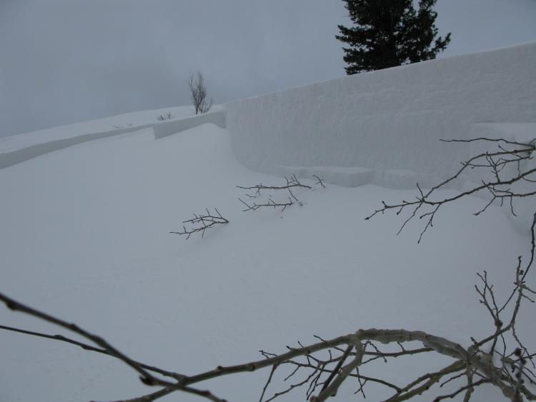 We remote triggered this nice Hard Slab avalanche from around 40' away. I was riding the sled on a popular backcountry route and Josh was skiing nearby on our way down for the day..... The avalanche failed and ran on buried persistent weak layers. In part of the crown, the avalanche stepped well below the very hard MLK ice-crust (1/16) running on the surface hoar/ nsf layer buried on 1/8/2011.
