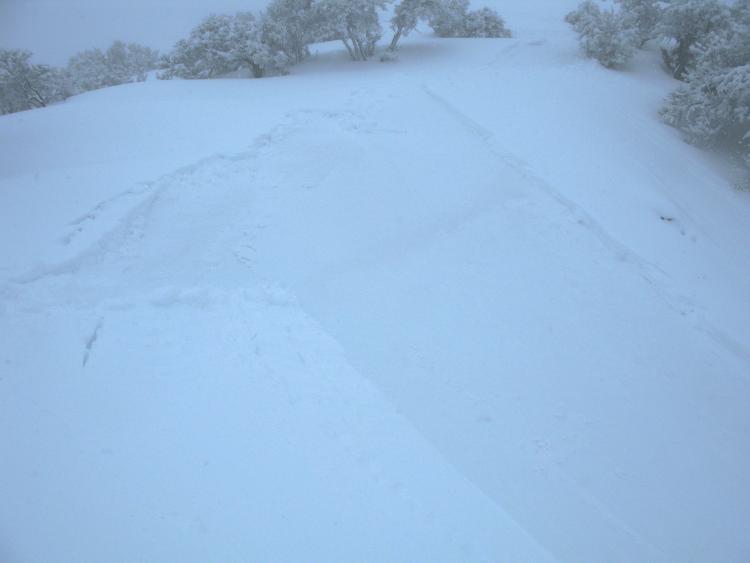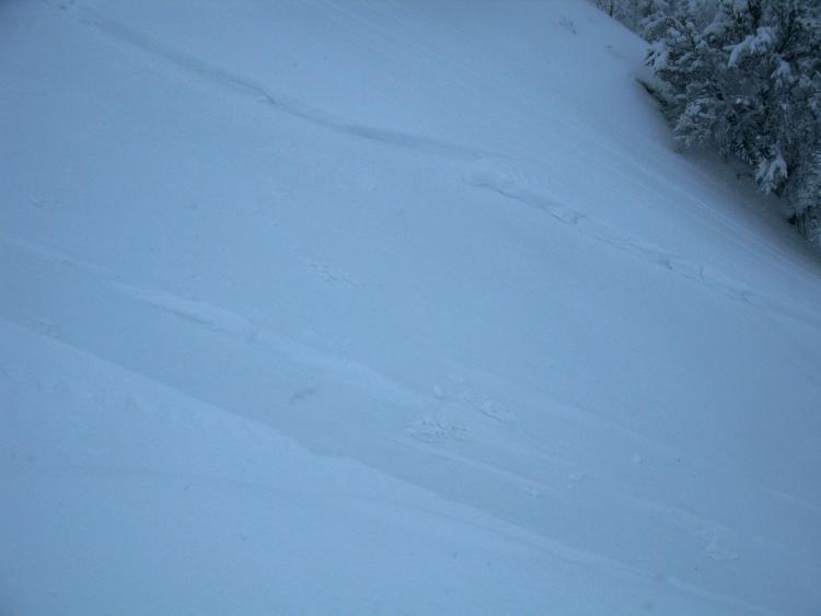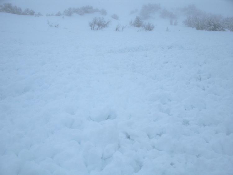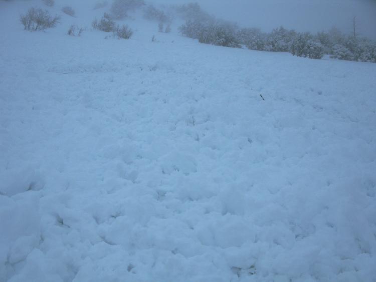 I intentionally triggered a number of moist but very soft sluffs involving the fresh snow in the Third Knob Area, south on the ridge from the top of Beaver Mountain..... The sluffs pulled out all the new snow, running on a sun-crust from the end of last week, and by the time I had crossed the bowl there was a significantly large pile of fresh debris below the not-all-that-steep slope....