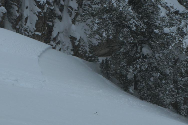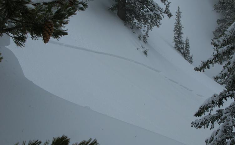 Not sure if we remote triggered this, or if a small cornice dropped a bit down-ridge did the trick... Even could have been natural, as we noted extensive drifting and rapid cornice build-up. Came around the corner on the ridge-line and noticed this very fresh (only minutes old) soft wind slab or storm snow avalanche.. The avalanche involved drifted snow from overnight and today and snow from Monday, and it ran on the interface of the dusty snow that was on the surface last weekend... Looked like remote triggered cornice fall from us around 100' away or small recently dropped cornice chunks rolling low on an adjacent slope. Either way, showed evidence of pretty sensitive conditions.....