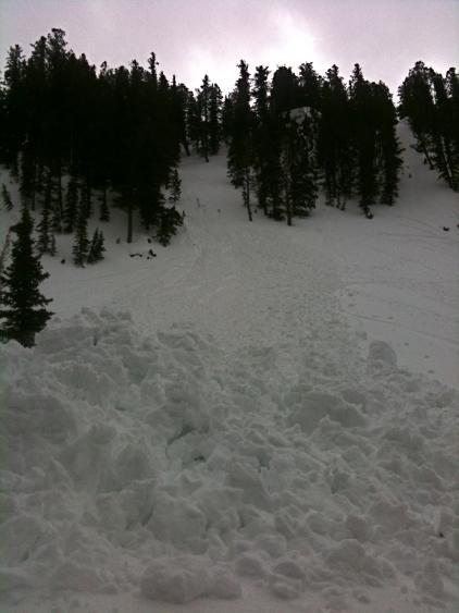 The slope I was about to ride looked suspect - somewhat wind loaded hanging field rolling off into very steep terrain. I chose not to gut the intended line and instead I made a few hard turns on a safer looking subridge. The wet slab broke loose about 30 feet to my right - in the middle of the originally intended line. I let it pass and it took the majority of the snow in the chute down with it, piling up about 6 feet deep at the bottom. This one started out as a pretty small and shallow slab but it brought down a lot of thick heavy snow made a pretty big mess at the bottom.