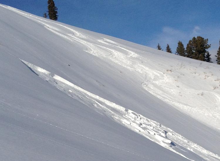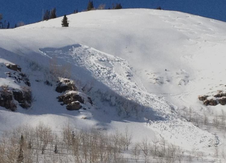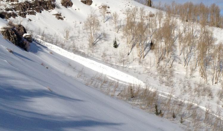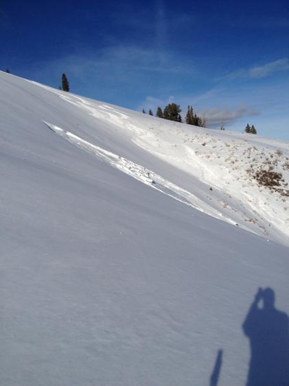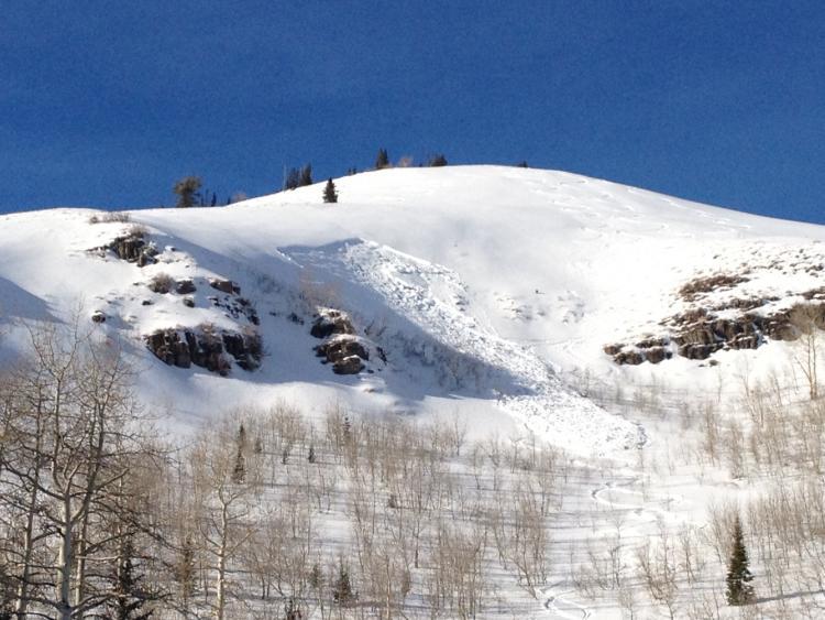 Remotely triggered avalanche on White Pine Knob, east aspect with a little north in it, seemed to be a wind deposition area. Dust on buried snow surface and radiant heat from opposing slope may have played a factor. Skiing generally challenging. lots of crusts of varying thicknesses.