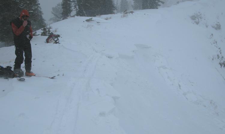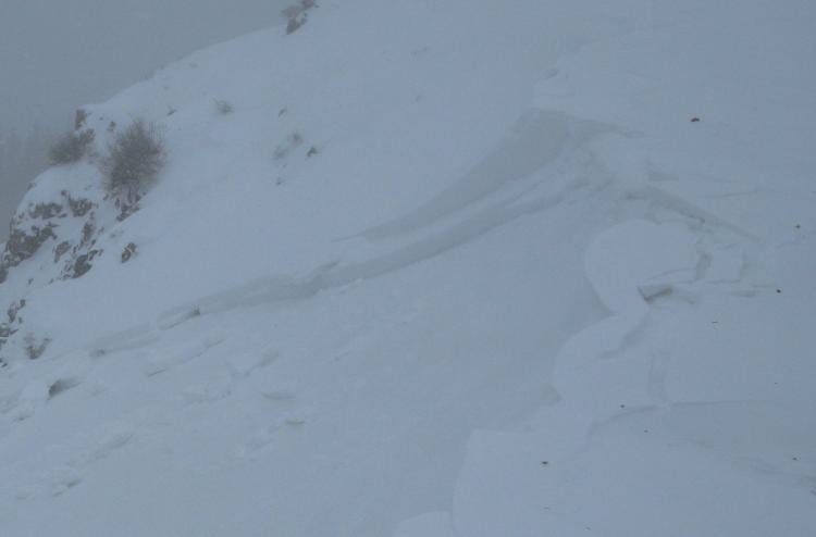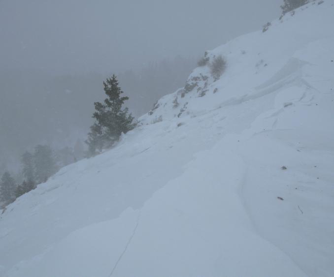 Before the storm even really got going this morning, I triggered this wind slab avalanche from the flats on the ridge.... Cracks propagated from my skis down into the slope below me as the slab failed. It was very sensitive. Even though this was not a very large avalanche it ran far, entrained a fair amount of sugary or faceted snow, and would have been a very dangerous or deadly ride if you got caught..