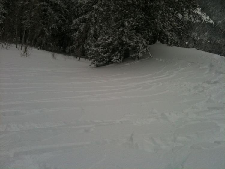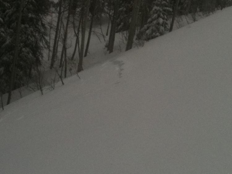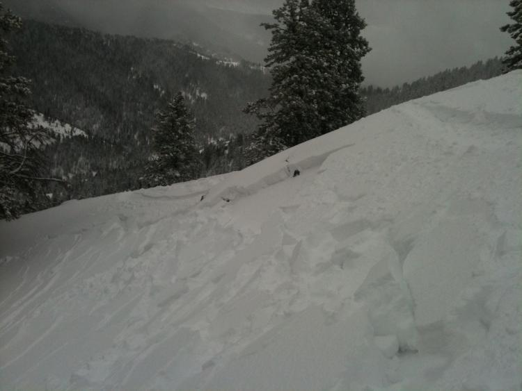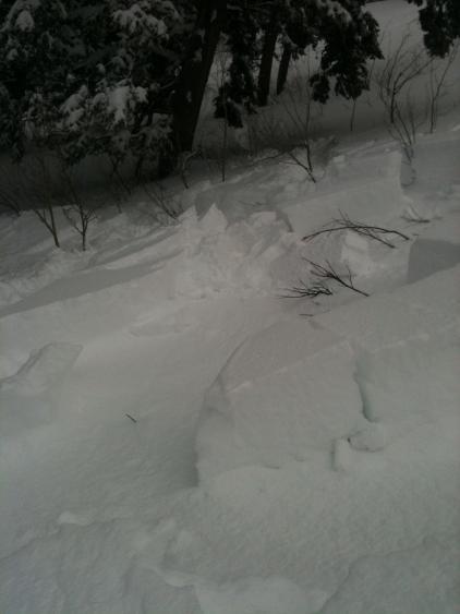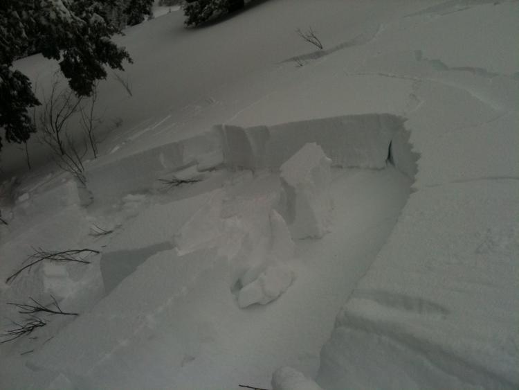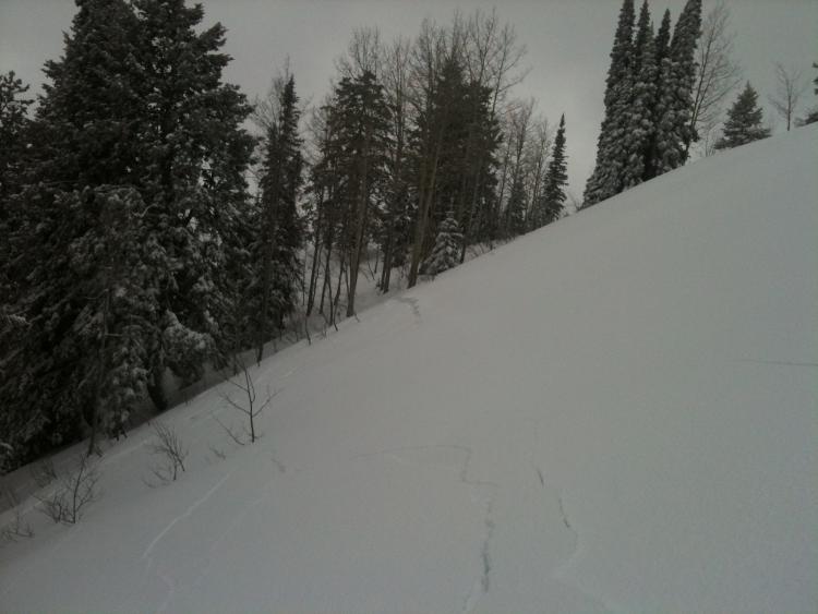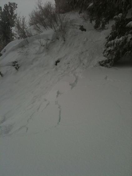 We observed numerous small avalanches and fractures on the backside of Beaver today. They picked up about 14" last night so everything was more sensitive than yesterday. None of these ran far due to the low slope angle but in addition to shattering cracks there was some more movement today. Some of the cracks we observed went to the ground, some were just the new snow. Wild to see an entire area fracture, move about a foot, then stop. Alot of whumpfing and collapsing under foot. Most of these events occurred on East/NE facing slopes way below the ridgeline. Terrain features like cliffbands and sub-ridges seemed to have these pockets tucked nicely away on the leeward side. Many skiers triggered fractures with no idea that they had. A few of the steep cliff bands did produce avalanches that ran a couple hundred feet.