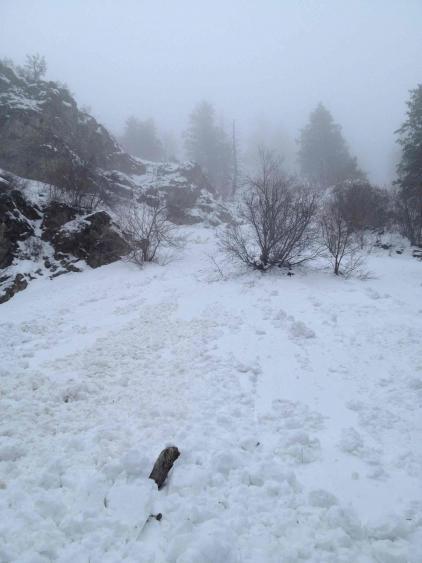 Avery spotted a wet avalanche that likely occurred yesterday (2/11/02) along Providence Canyon road. Visibility was poor so it's difficult to say how far it slid, but judging by the debris pile and slope characteristics I'm guessing about a hundred feet or so. We noticed a number of snowmobile tracks on similar slopes and aspects and I'm guessing that, though this slide wouldn't bury you, it would defiantly be enough to knock an unaware rider off a sled.