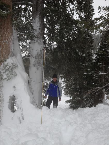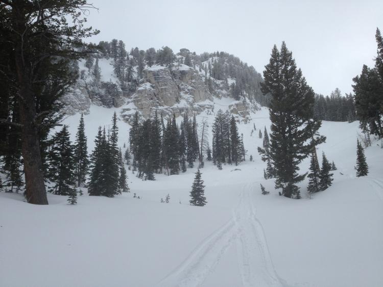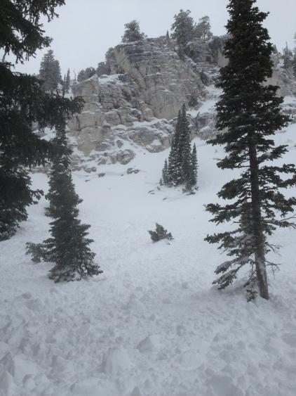 Rider was side-hilling on about a 20 degree slope when the hillside released uphill to a cliff band. Rider was able to stay on his sled and rode with in avalanche for approx. 50 yds until he out ran it. The slide ran through some large trees. As the wave of snow went through it left snow on the tree trunks about 12 ft. up.