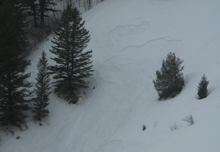 On the way up canyon, I could see evidence of widespread natural avalanche activity on slopes facing every direction and at all elevations... I could only catch a brief glimpse of higher stuff, and could see a handful of pretty long running avalanches up high above the lower part of the Canyon.... I noticed a few new slides on the way back down in the early afternoon, so natural activity was occurring today as one might expect. Included photos of a shallow release in Red Banks, wind slabs under the Swan Flats Cliffband on a southwest facing slope, and the west ridge-line of Amazon Basin drifted east facing slope..
