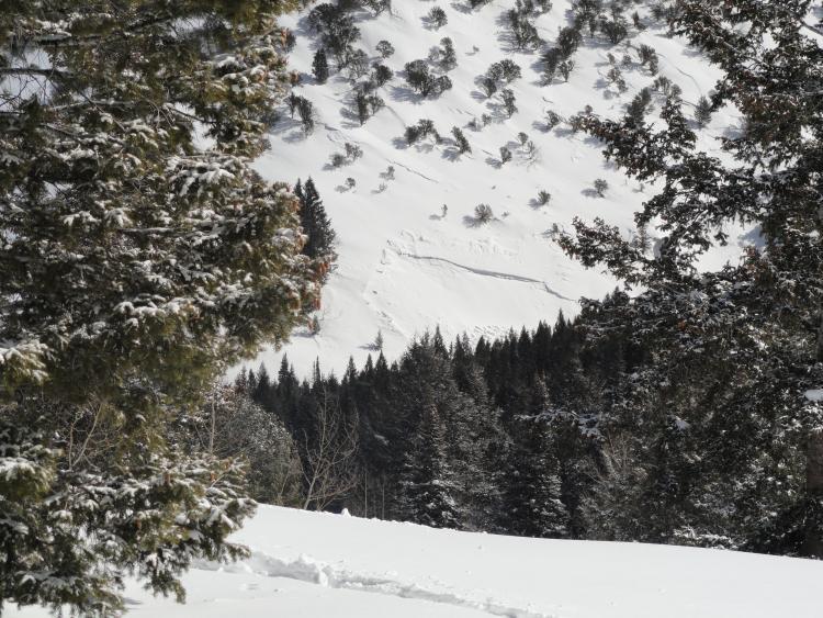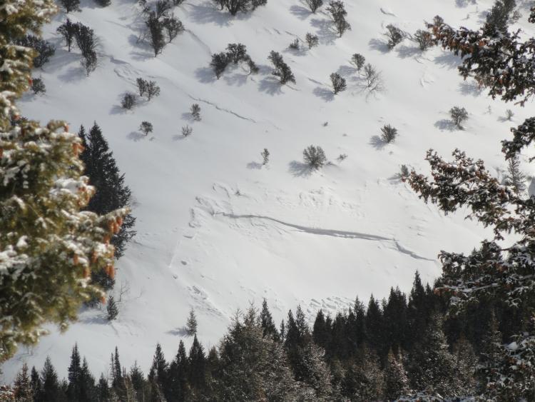 Hard slab natural, dimensions estimated from tree size. Skiing was lackluster compared to monday so I stopped to take this picture. Overnight Weds. or early Thursday.