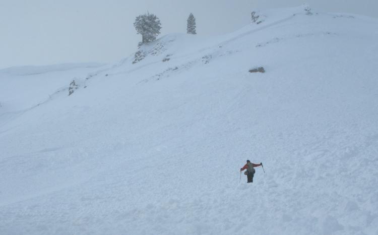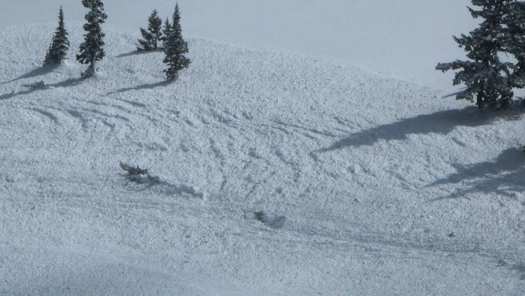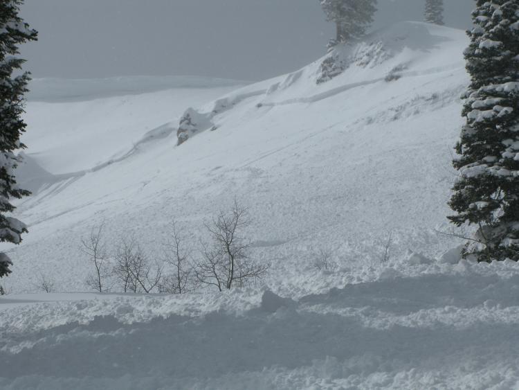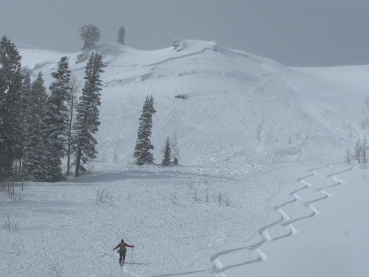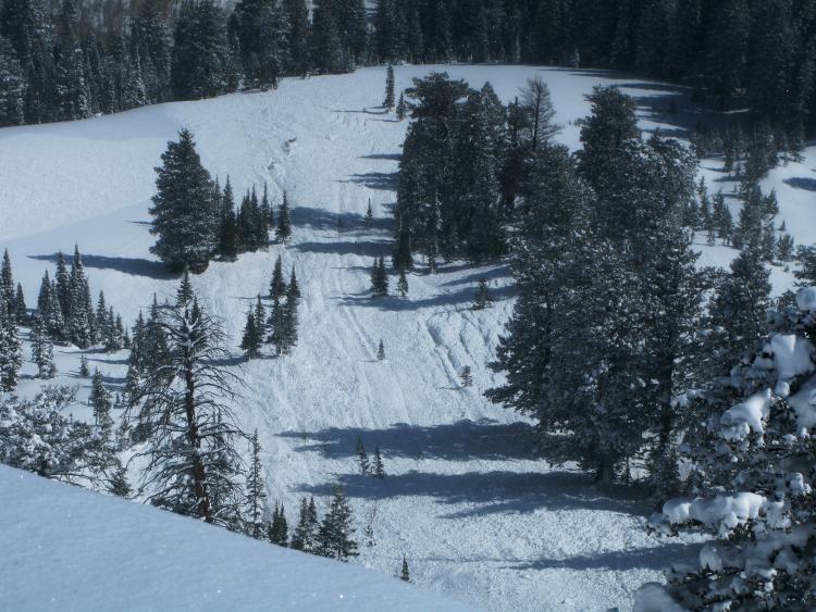 This is looking up at the northern avalanche. It was a sympathetic release, after the first one ran. I triggered a pretty good sized piece of hang-fire trying to get into the avalanche to have a look. The slab broke apart around and above me, and I almost deployed my airbag, but pointed em straight down the hill and was able to outrun and escape the serpent.... If you look closely, you can see my straight-line escape track a little to the right of the northern flank of the avalanche. The 2' deep hang-fire avalanche pulled out and overran a good number of Darren's ski tracks.