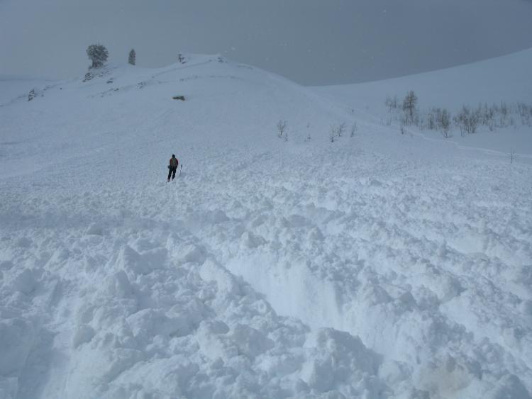 The debris from both avalanches was quite extensive to say the least..... difficult to describe.... Spread over many acres. Deep piles on uphill side of trees and in dips in terrain, some large trees down in the southern avalanche