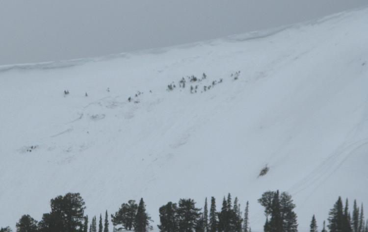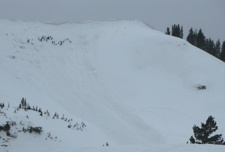 This natural avalanche was a large cornice fall triggering a hard slab below. It probably happened during the warm-up on Sunday 3-4-2012, possibly yesterday the 5th as well....