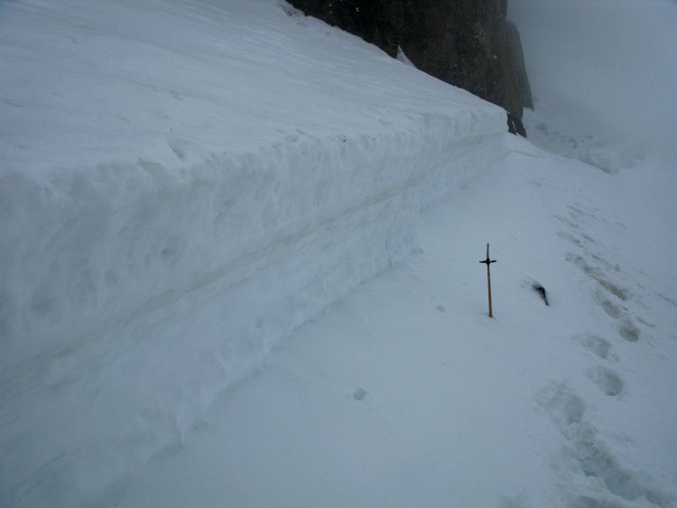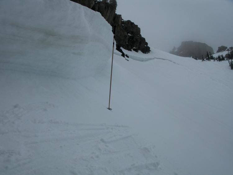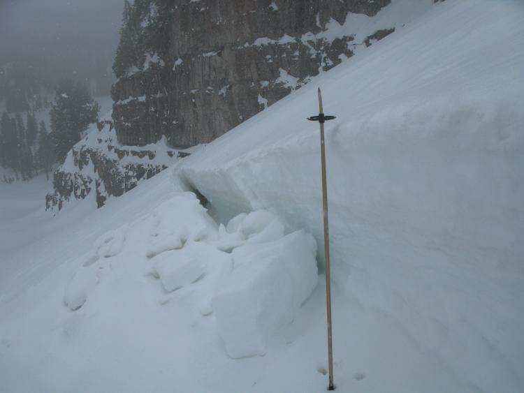 I went up to the site of the near miss on 3-14-2012 and took a few more photos and a few notes about the slope, the avalanche, and the snowpack... A dust layer, most likely from the windy storm at the end of February is apparent high in the crown face. Looked like the avalanche released on a thin weak layer just above another hard dusty layer from the last days of 2011....