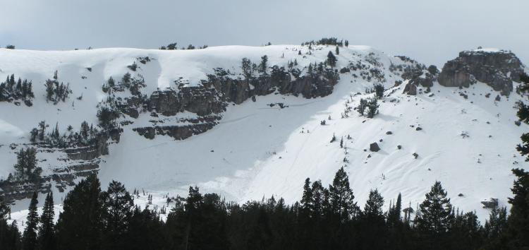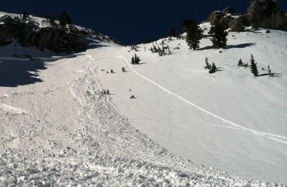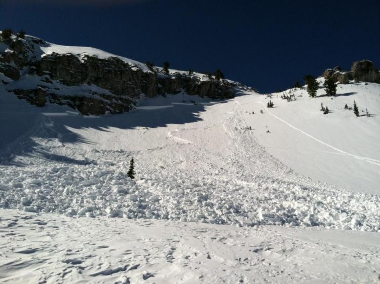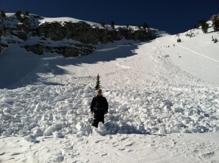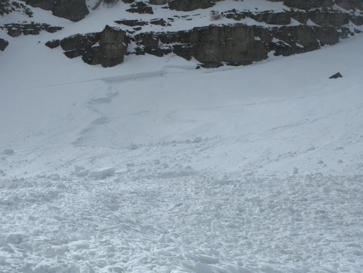 Apparently two riders managed to escape a large hard slab avalanche that they triggered off Double Top Mountain or "Gunsight Peak" in upper Steep Hollow... One rider likely triggered the avalanche from high on the slope and was caught near the top of the avalanche. He managed to stay on his sled and power off the moving slab out and off the northern flank of the avalanche. It looked to me like he was carried a couple hundred vertical feet by the deadly slide before he escaped out into the large eastern face of Double Top. The sled tracks to the right of the avalanche in the photos are telling.... The other rider was climbing lower on the slope when the avalanche occurred and was able to turn his sled downhill and outrun the avalanche.. The broad avalanche piled up deeply at the bottom of the slope, reportedly at least 15 feet deep....
