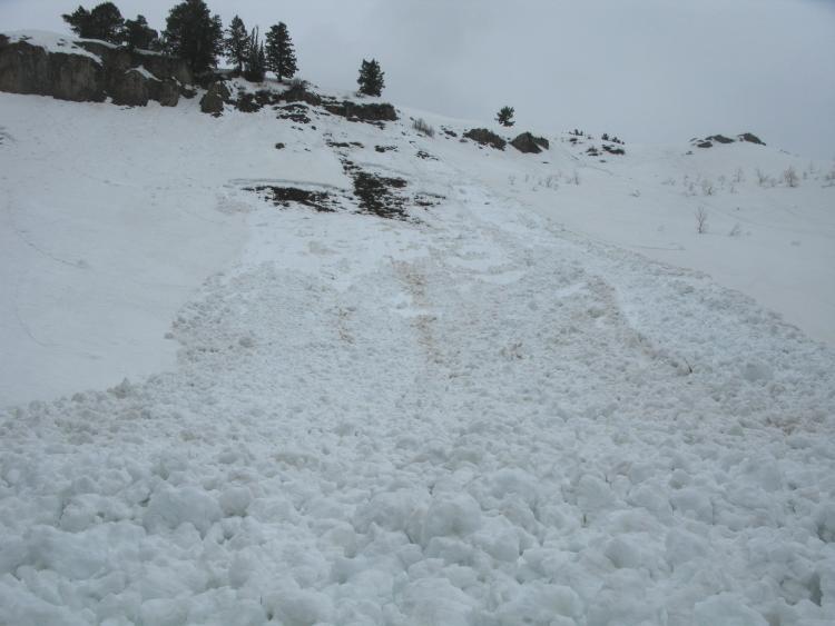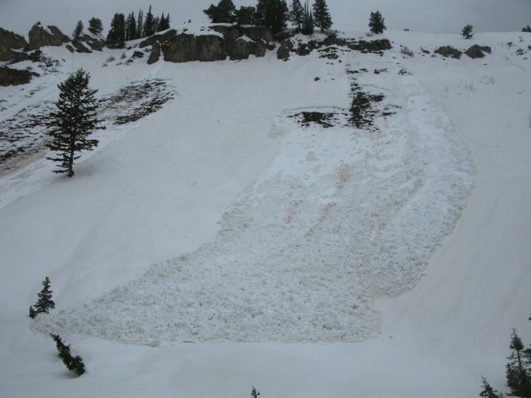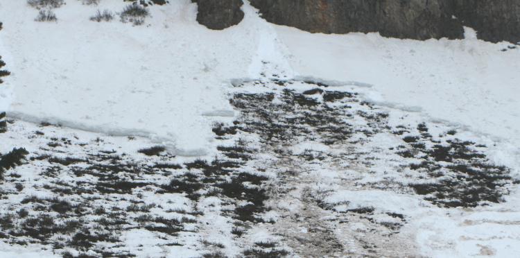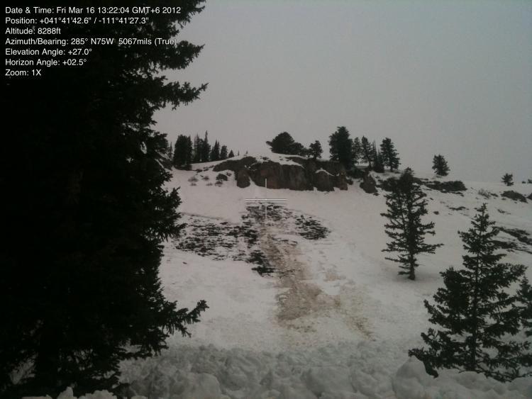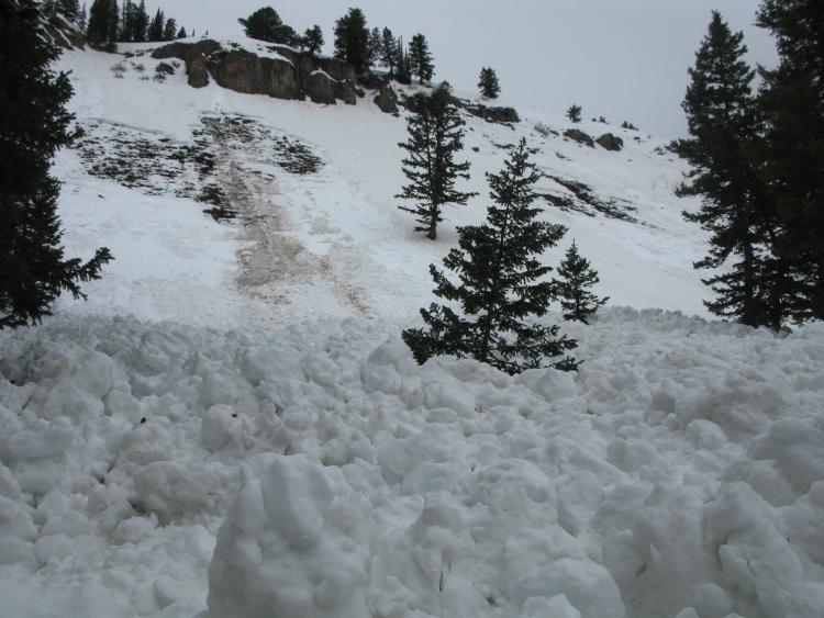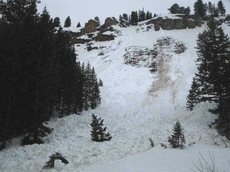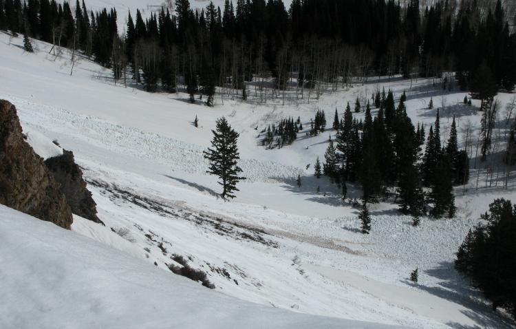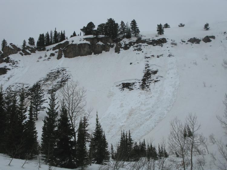 We stumbled across these recent large wet slab avalanches, looking down into South Hollow from the Sunday Camp Saddle in Providence Canyon. The broad and deep slabs appear to have been triggered by wet sluffs that initiated in the rocks above and overran the steep slopes below. The avalanches ran on basal layer depth hoar, cleaning out the entire shallow winter's snowpack... I'm not sure when in the last few days these ran, but I'm guessing on the very warm ides of March (3-15-2012)......