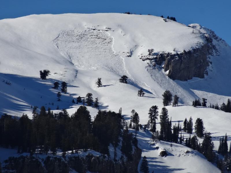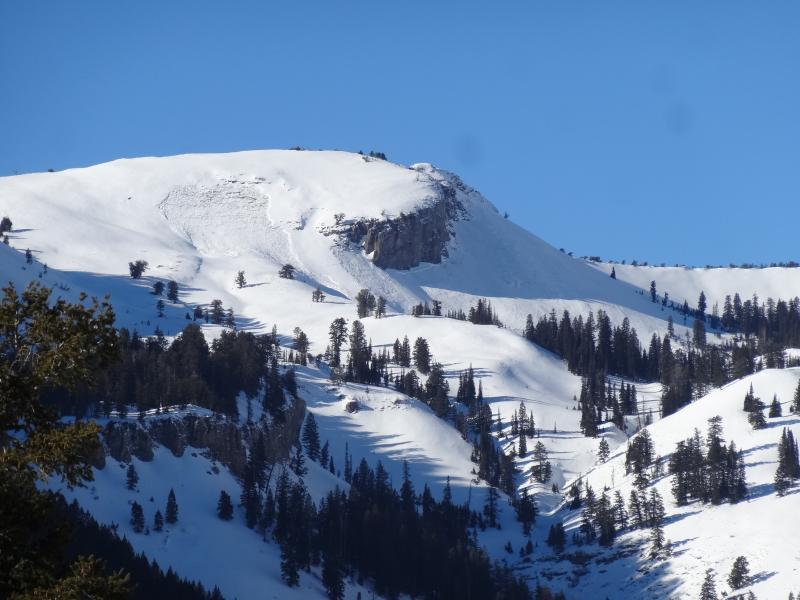 Saw this slide on the east face of Mt. Fudd from the upper part of the Jardine Juniper tail. It came down right where the summer trail crosses under Fudd and looks like it was part of the Christmas eve avi cycle that was reported further north in Cottonwood and Cornice ridge. The left (due east facing) part of the slide first caught my attention but shortly later I noticed a sympathetic (?) slide just to looker's right below the cliff bound that continues around towards Mt. Elmer. Looking at the zoomed-in photo, I now see the crown on this part of slide continues along the base of the rock band 1,000 or more feet around towards the north toward Elmer so the slide spans aspects from ESE to NE. I couldn't see the run-out zone from my vantage point but in the photo the slide ran at least 400 vertical ft.