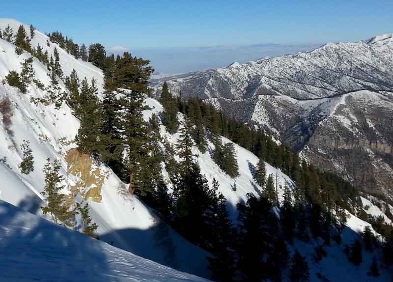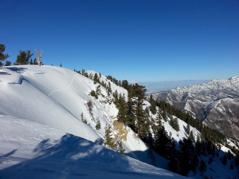 Checked out this natural slide on a wind loaded easterly slope from the ridge between the Folly and Logan Canyon. Ripped to rotten facets and ran deep into the drainage below, perhaps a thousand plus feet.